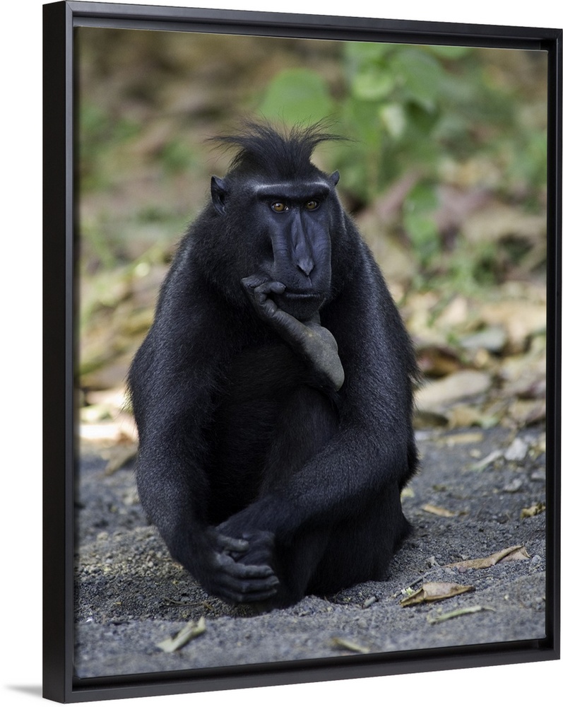 <p>A portrait of a monkey sitting on the ground in a humorous pose as if pondering a thought.</p>
