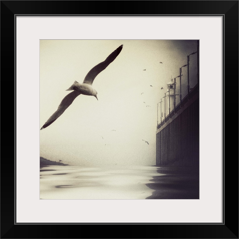 <p>A seagull flies low over the water, its flock-mates and a lighthouse in the distance.</p>