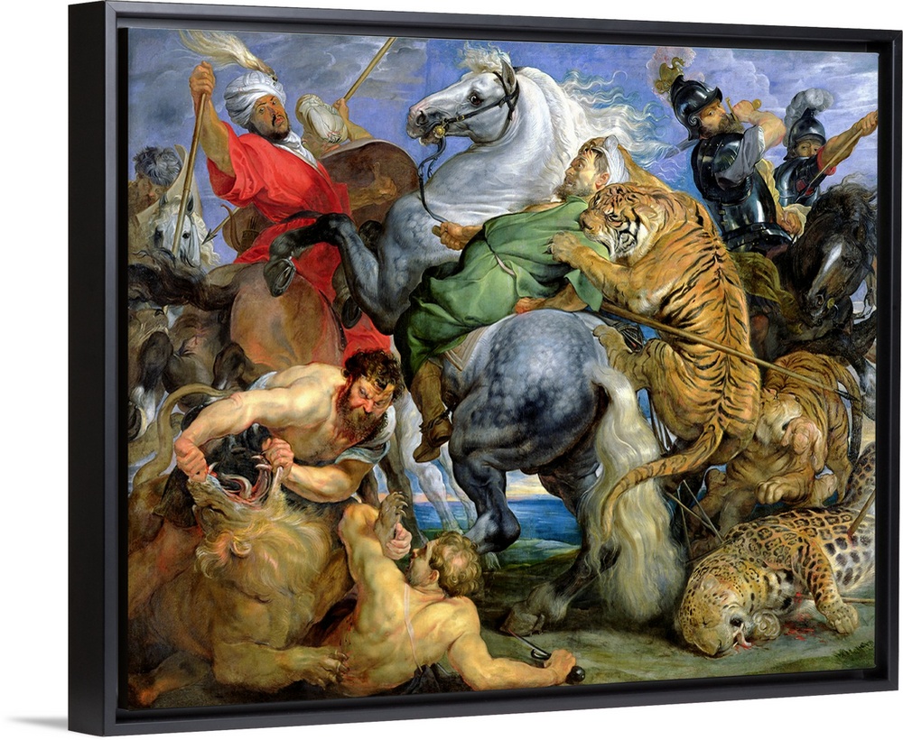<p>Oil painting of horsemen and wildcats fighting. One man is wrestling a lion on the ground while one horse back rider is attacked by a tiger.</p>