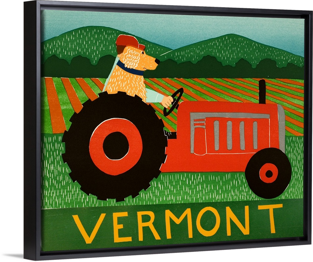 <p>Illustration of a yellow lab riding on a red tractor with its owner with "Vermont" written at the bottom.</p>