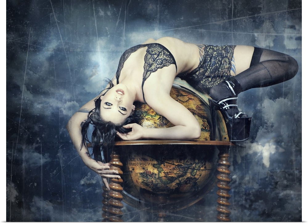 <p>A dark haired woman in black and gold lingerie, stockings, and heels lays draped across an antique globe. The globe floats amongst clouds, supported by carved wooden columns.</p>