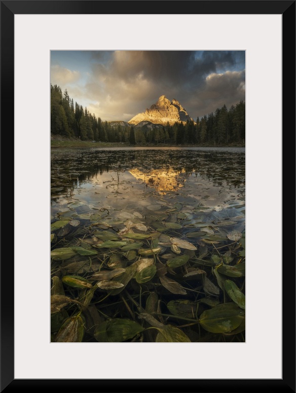 <p>The Tre Cime di Lavaredo reflecting in the Antorno lake during an early autumn sunset, with some algies in the foreground. Dolomites, Italy.</p>