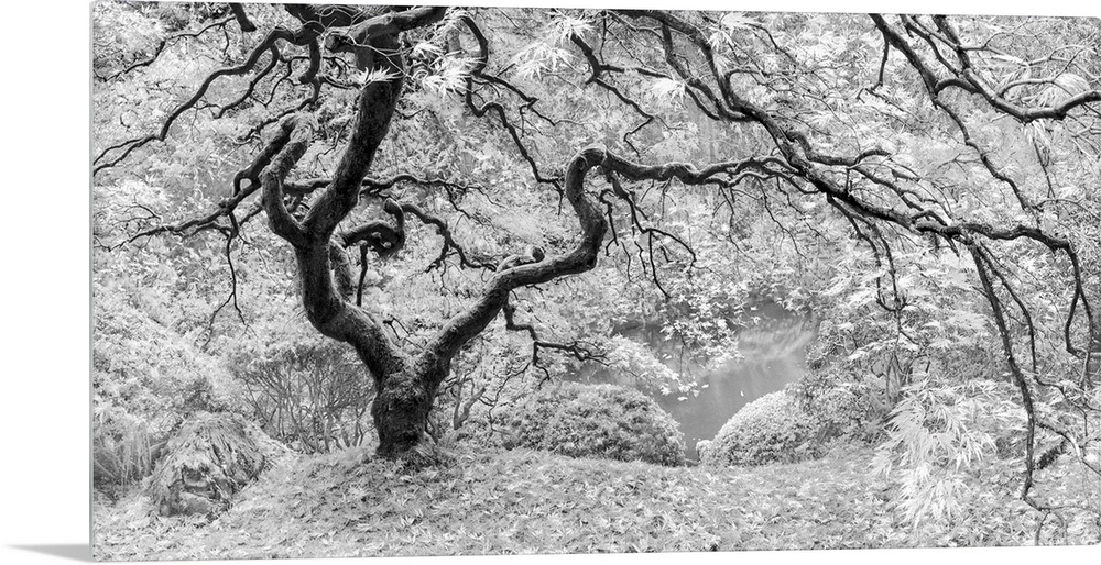 <p>An artistic black and white photograph of a gnarled tree in a garden.</p>