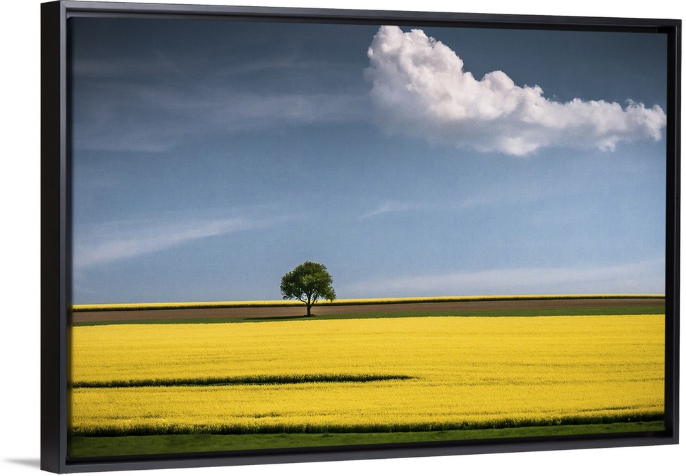 <p>A tree in the center of a bright yellow canola field with a lone cloud floating by.</p>