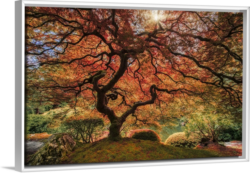 <p>An artistic photograph of an old Japanese maple tree in autumn foliage in a zen garden.</p>