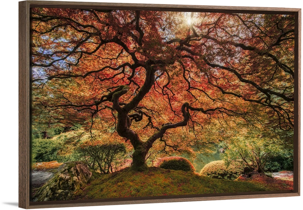 <p>An artistic photograph of an old Japanese maple tree in autumn foliage in a zen garden.</p>