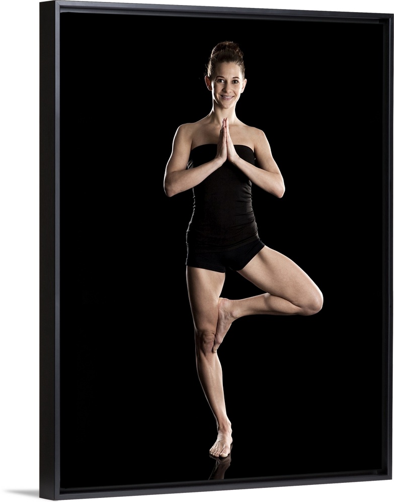 <p>Studio shot of young woman practicing yoga. The tree pose, Vriksasana.</p>