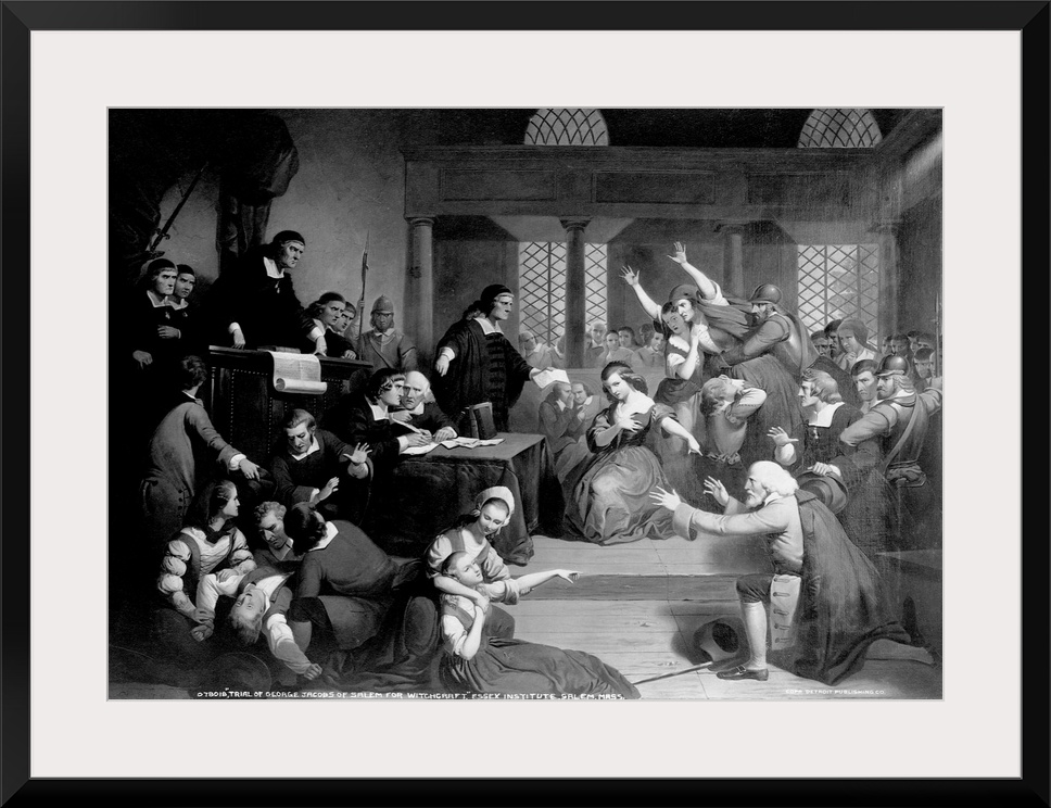 <p>A portrayal of the 1692 witchcraft trials in Salem, Massachusetts shows George Jacobs (right) attempting to plead his innocence as young girls and townspeople in varying states of hysteria accuse him of witchcraft before a tribunal of judges. | Located in: Peabody Essex Museum.</p>