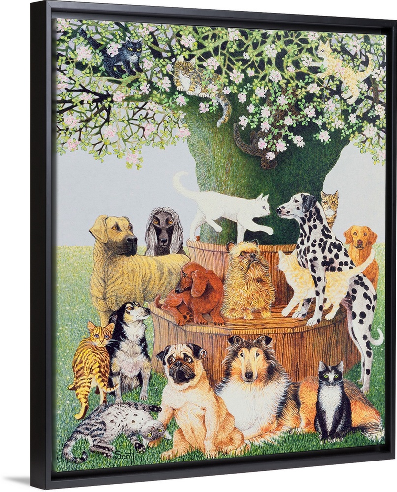 <p>Contemporary painting of a variety of different dogs and cats around a tree.</p>