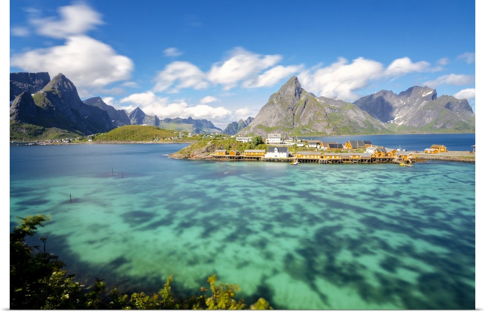 <p>The turquoise sea frames the typical fishing village surrounded by rocky peaks, Sakrisoy, Reine, Moskenesoya, Lofoten Islands, Norway, Scandinavia, Europe</p>