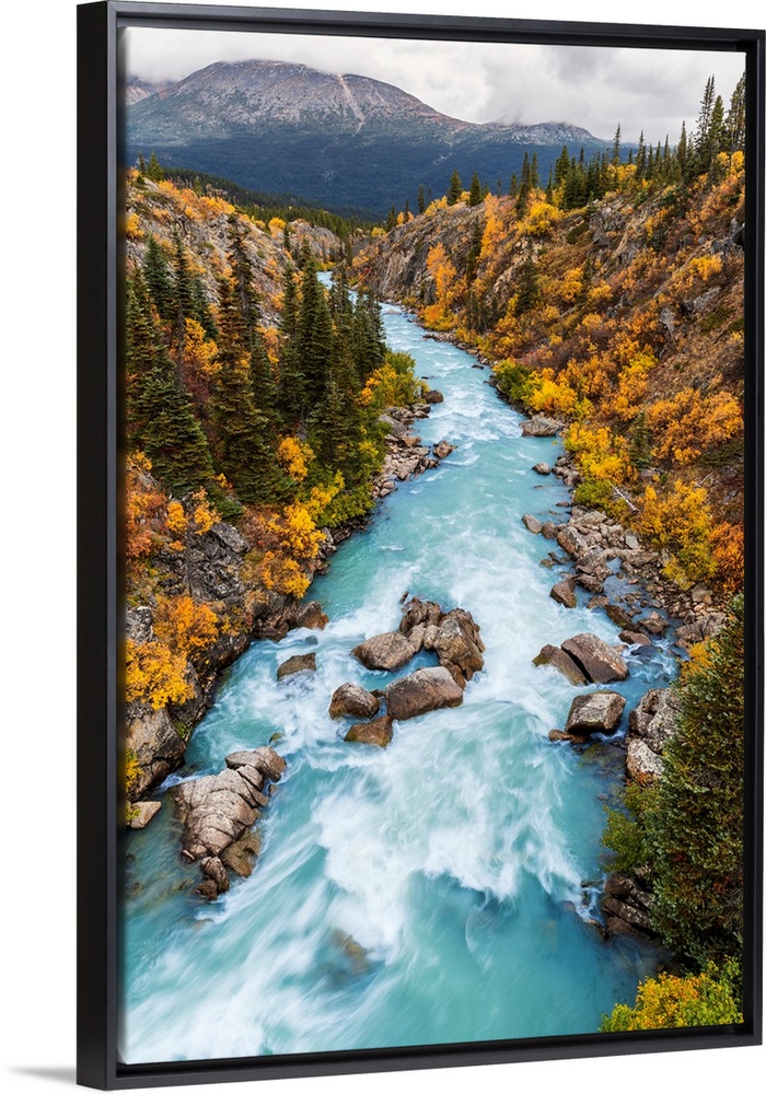 <p>The Tutshi River canyon as seen from the suspension bridge, British Columbia, Canada, Fall.</p>