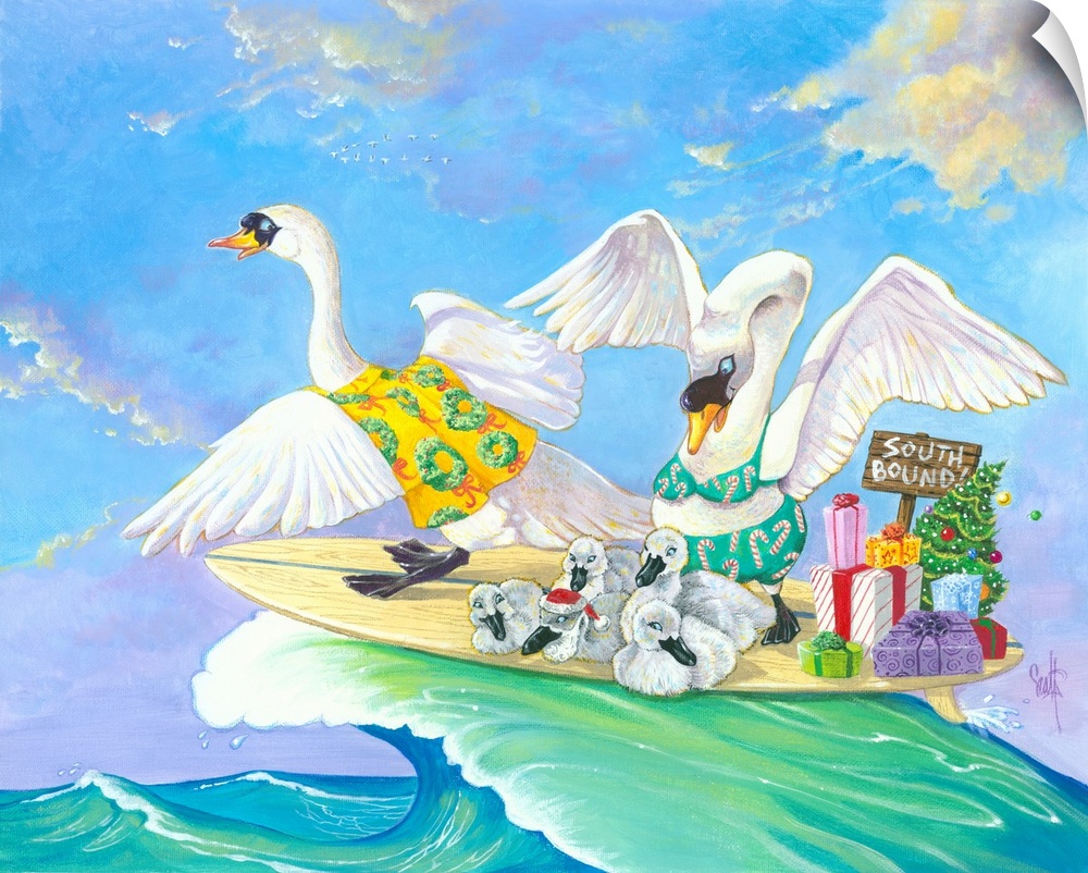 <p>A hilarious take on the classic Christmas song; a family of swans in Christmas-themed swim suits and a pile of gifts are riding on a surfboard. Perfect for Christmas in July or beach lovers at any time of year.</p>