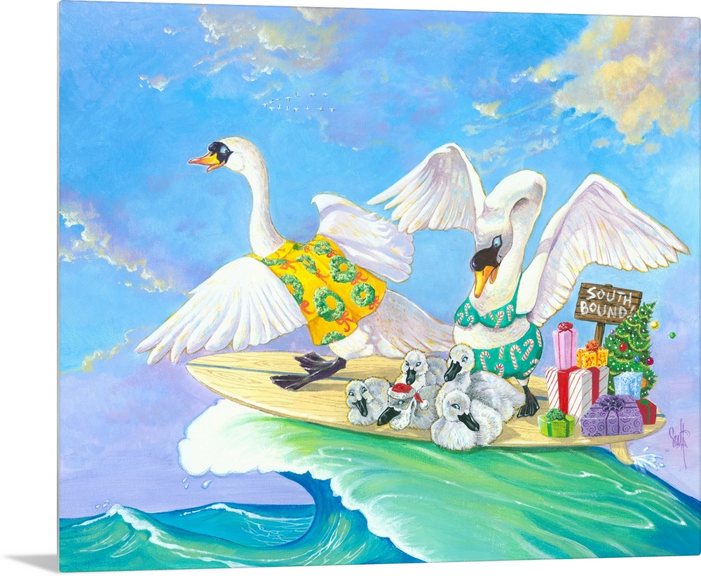 <p>A hilarious take on the classic Christmas song; a family of swans in Christmas-themed swim suits and a pile of gifts are riding on a surfboard. Perfect for Christmas in July or beach lovers at any time of year.</p>