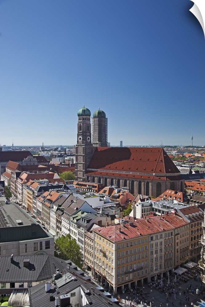 <p>The twin towers of the Munich Frauenkirche and the Marianplatz viewed from the steeple of St. Peter's Church, Munich Bayern, Germany.</p>