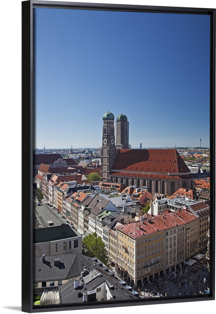 <p>The twin towers of the Munich Frauenkirche and the Marianplatz viewed from the steeple of St. Peter's Church, Munich Bayern, Germany.</p>