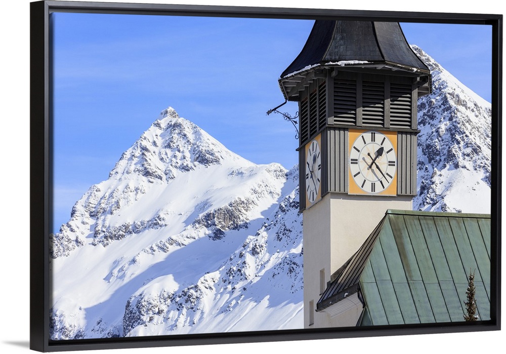 <p>The typical alpine bell tower frames the snowy peaks, Langwies, district of Plessur, Canton of Graubunden, Swiss Alps, Switzerland, Europe</p>