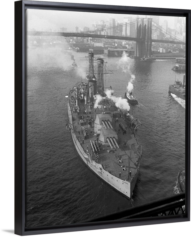 <p>Photo shows the U.S.S. Arizona, largest and newest of Uncle Sam's sea fighters passing out to sea under the Brooklyn Bridge on her first voyage since being put in commission.</p>