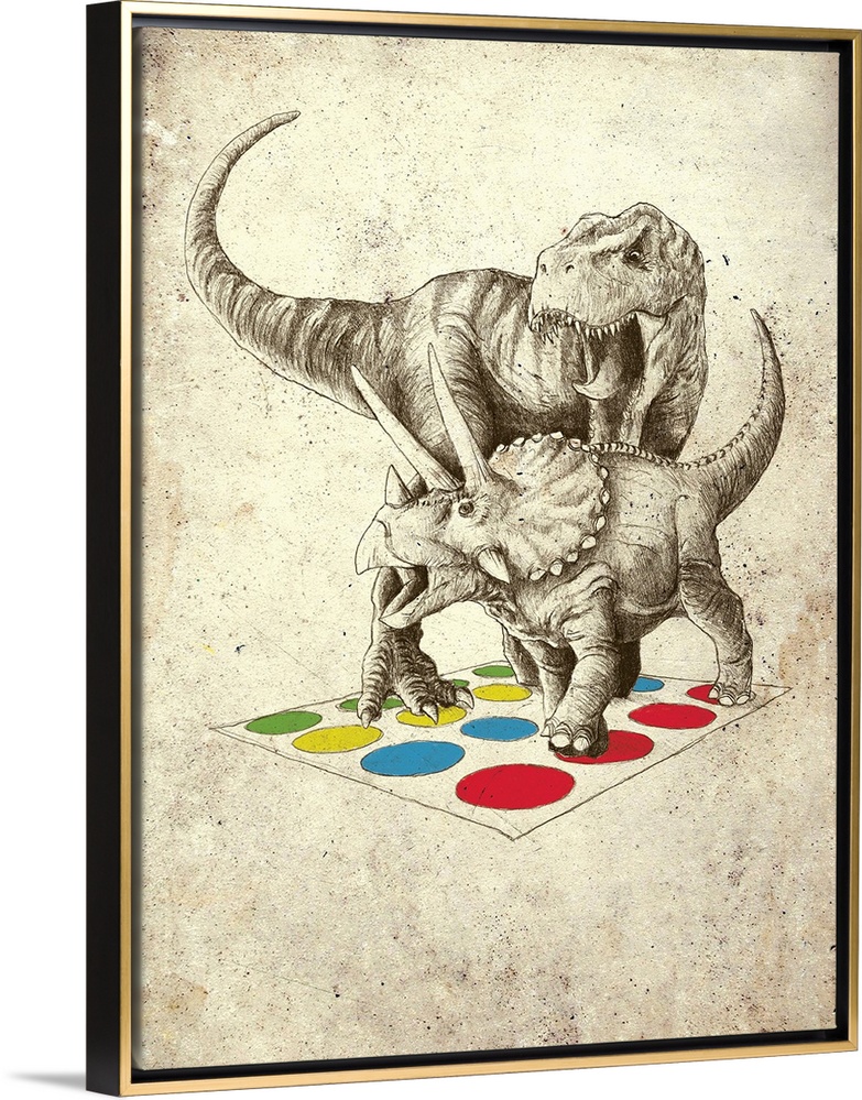 <p>A digital illustration of dinosaurs playing the game Twister.</p>