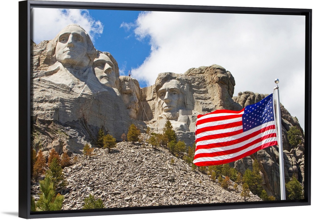 <p>The United States flag proudly flying in front of Mount Rushmore.</p>