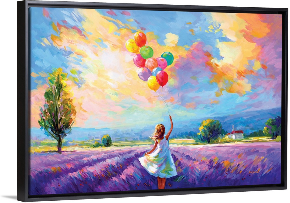 <p>A vibrant artwork of a young girl holding colorful balloons, running through a lavender field.</p>