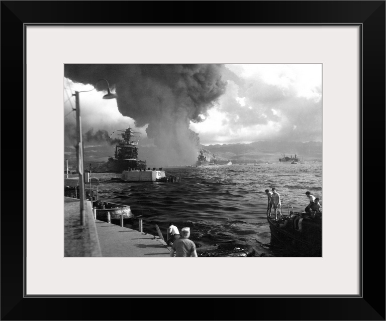 <p>The USS California (left) damaged during the Japanese attack on the U.S. naval base at Pearl Harbor, Hawaii, 7 December 1941, withthe USS Maryland and the capsized USS Oklahoma visible at right. Photograph, 1941.</p>