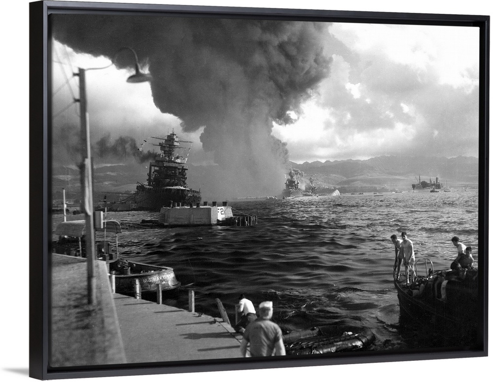 <p>The USS California (left) damaged during the Japanese attack on the U.S. naval base at Pearl Harbor, Hawaii, 7 December 1941, withthe USS Maryland and the capsized USS Oklahoma visible at right. Photograph, 1941.</p>