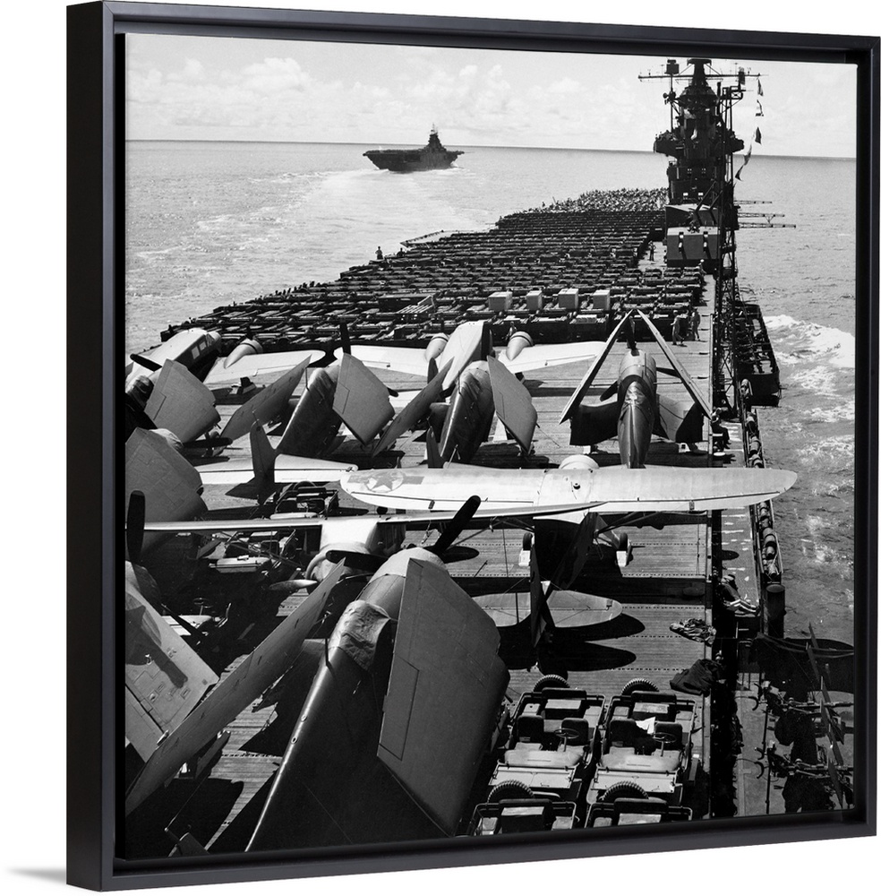 <p>The USS Yorktown aircraft carrier ferries planes and jeeps to battle fronts in the Pacific. Photograph, September 1943.</p>