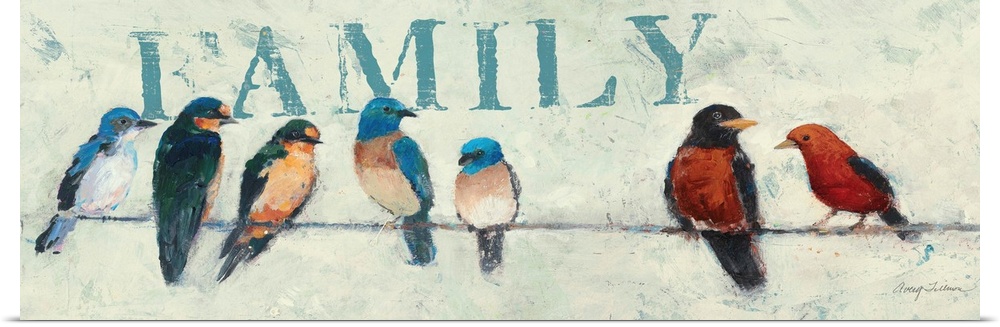 <p>Contemporary painting of garden birds sitting a wire, with the word "Family" in the background.</p>