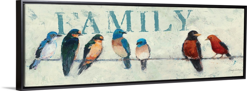 <p>Contemporary painting of garden birds sitting a wire, with the word "Family" in the background.</p>