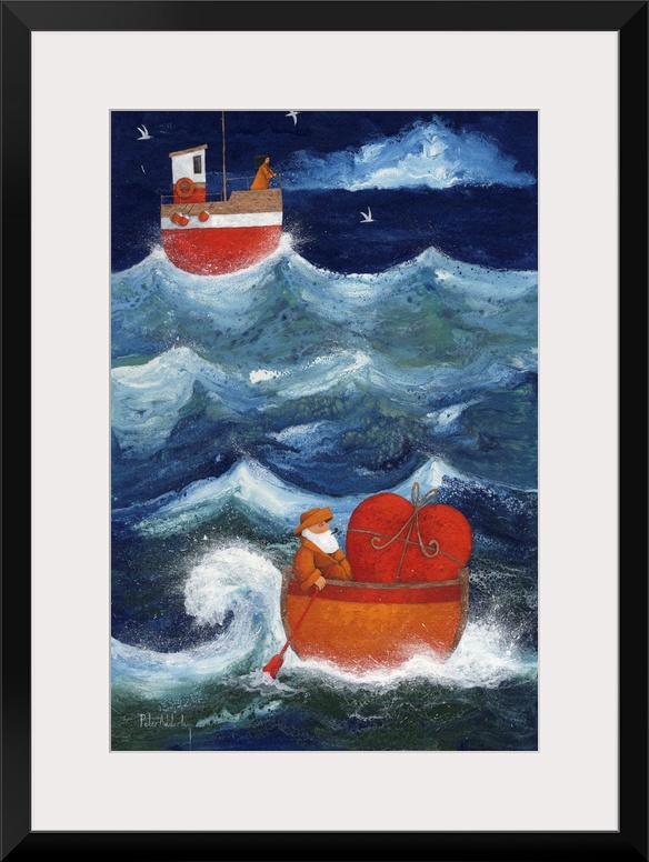 <p>Contemporary painting of a man in small row boat with a giant heart shaped present in it.</p>