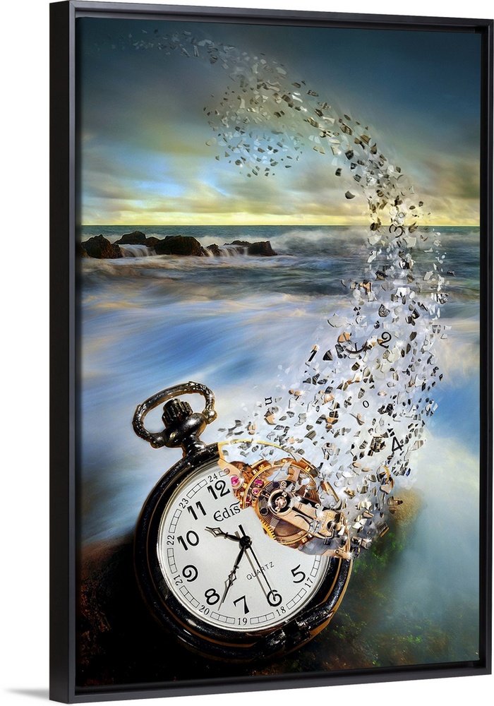 <p>Conceptual photograph of a pocket watch disintegrating over a coastline overlooking the sea.</p>
