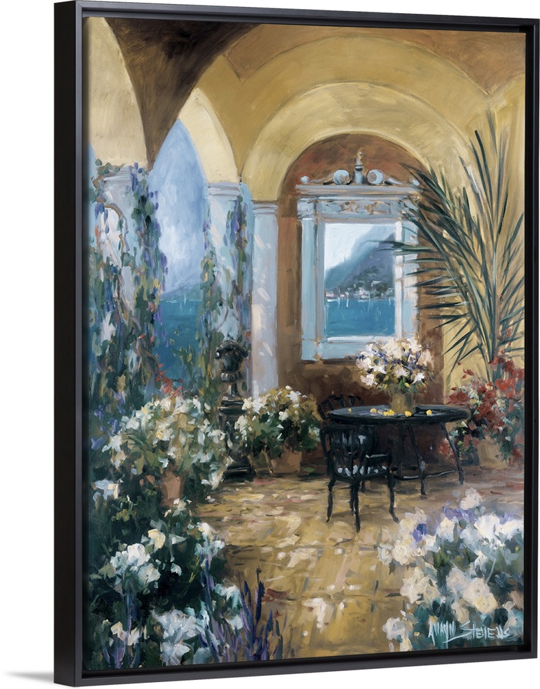 <p>Fine art oil painting landscape of an Italian courtyard terrace with flowering plants and a table for two by Allayn Stevens.</p>