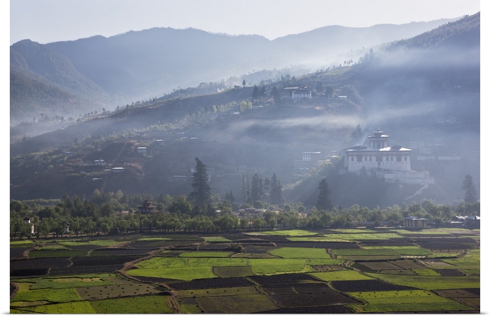 <p>The very impressive 16th century Paro Dzong , the fortress that sits on a heap of Jewels, and its round watchtower, now a national museum, photographed from across the fertile Paro Chhu River valley in early morning mist.</p>