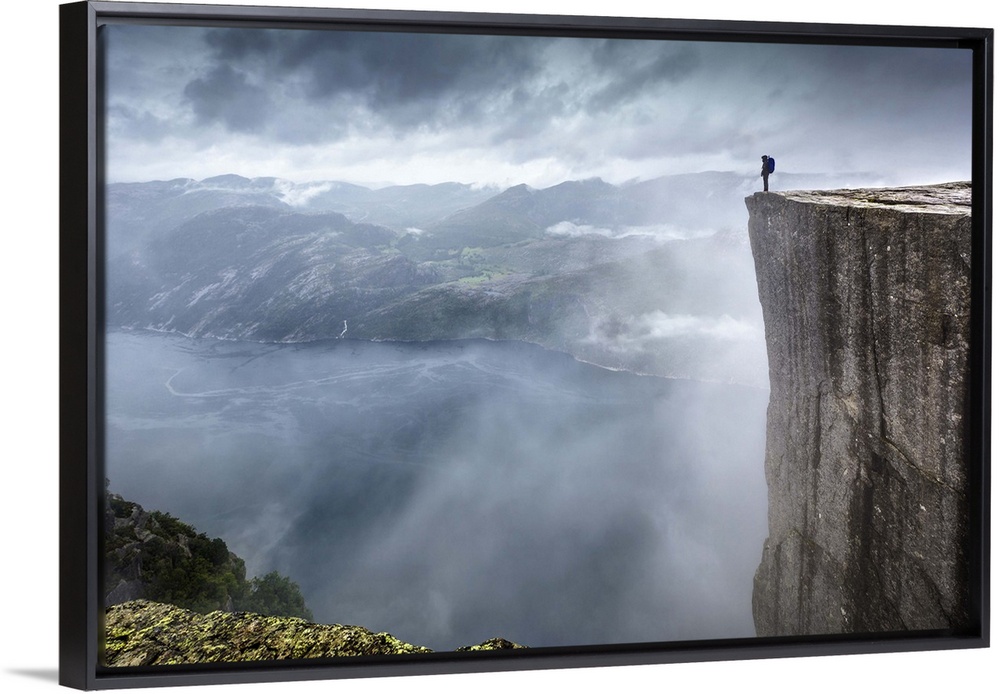 <p>A hiker stands at the edge of a steep cliff overlooking a misty fjord, Prekestolen, Norway.</p>