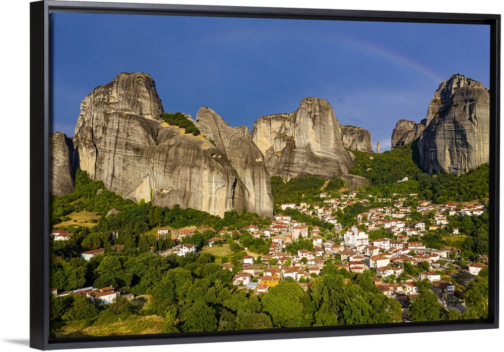 <p>Aerial by drone of the village of Kastraki in the huge rocks of the UNESCO World Heritage Site, Meteora Monasteries, Greece, Europe</p>