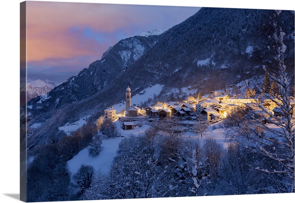 <p>The village of Soglio by night after a heavy snowfall, val Bregaglia, Grisons, Switzerland.</p>