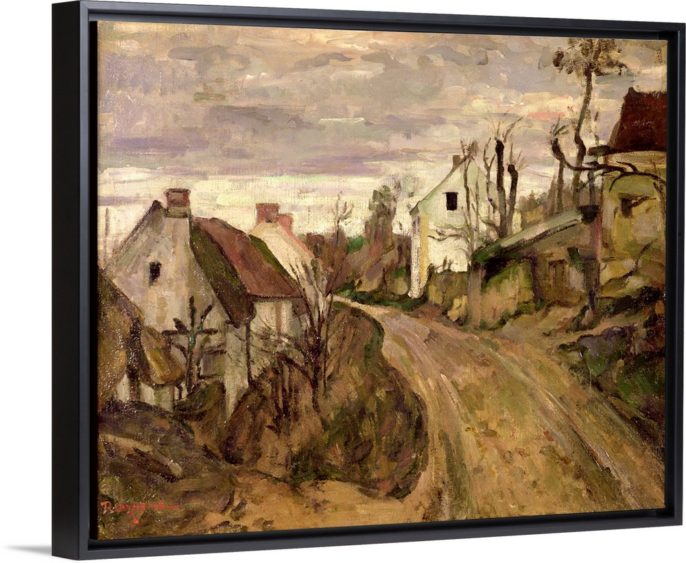 <p>Painting of a dirt road going through a small country town with houses on either side.</p>