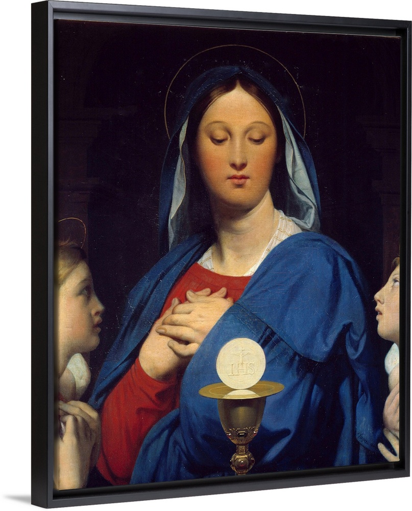 <p>The Virgin adoring the host. Symbols of communion: Object of the Eucharist (the host as the body of Christ and the wine of the Chalice as his blood). Painting by Jean-Auguste-Dominique Ingres (1780-1867), 1866. Oil on canvas. 0,78 x 0,67 m. Bonnat Museum, Bayonne, France</p>