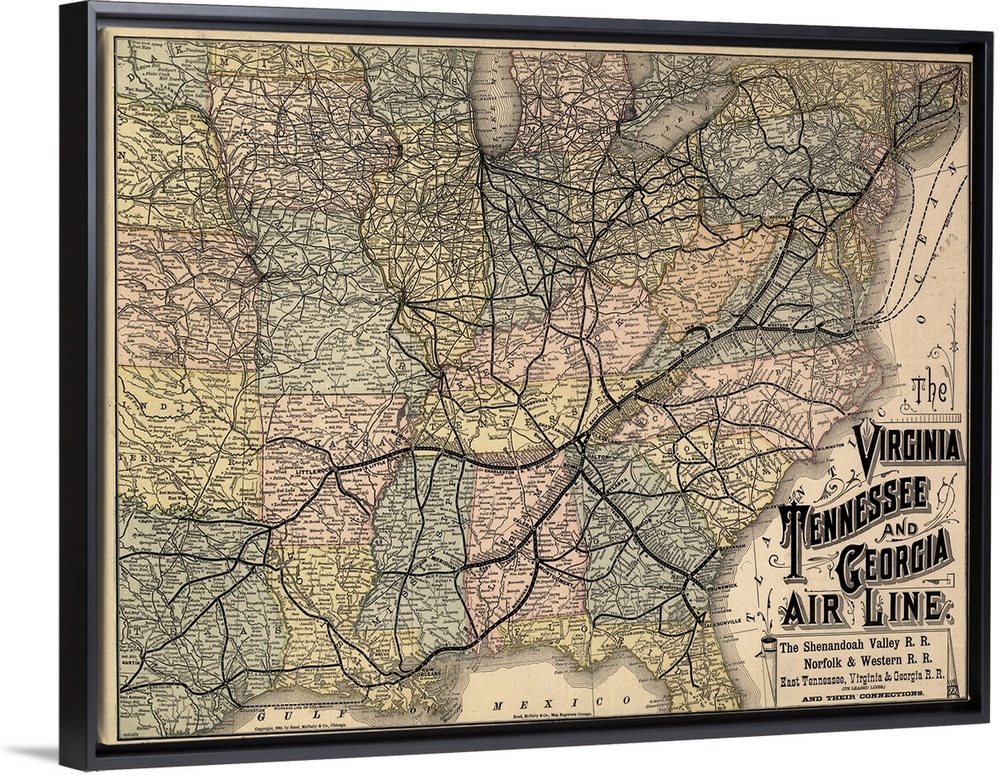<p>Map, Railroad, 1882. 'The Virginia, Tennessee, And Georgia Air Line; the Shenandoah Valley R.R.; Norfolk and Western R.R.; East Tennessee, Virginia, and Georgia R.R...' Map By Rand McNally and Co., 1882.</p>