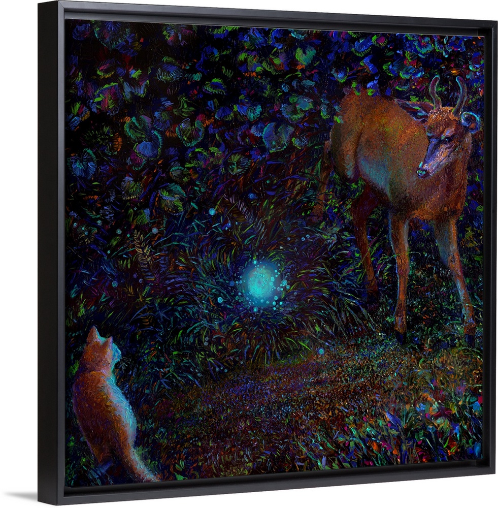 <p>Brightly colored contemporary artwork of a deer and a cat watching an orb.</p>