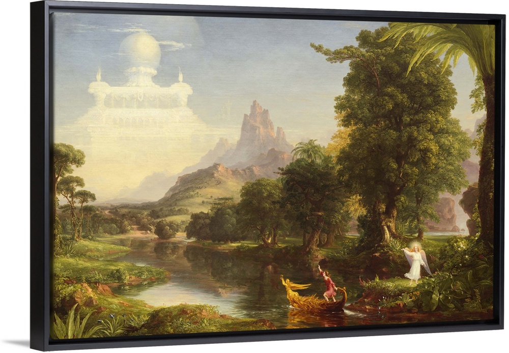 <p>The Voyage of Life: Childhood, by Thomas Cole, 1842, oil on canvas, American painting, oil on canvas. First of four paintings, 'The Voyage of Life' traces a man's journey along the 'River of Life.' A golden boat emerges from a darkened cave as a joyous in (BSLOC_2016_6_196)</p>