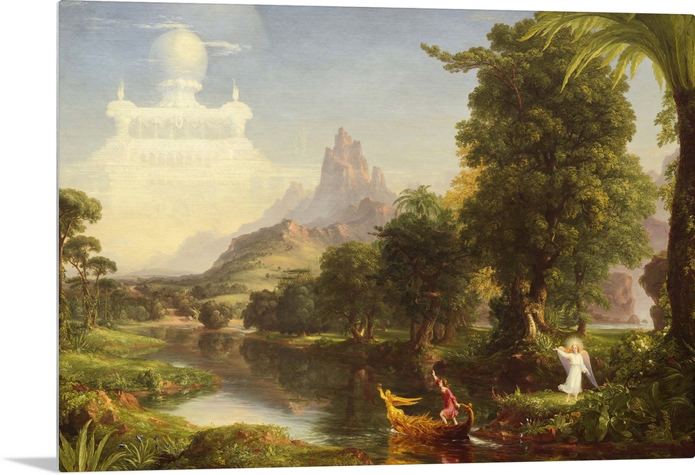 <p>The Voyage of Life: Childhood, by Thomas Cole, 1842, oil on canvas, American painting, oil on canvas. First of four paintings, 'The Voyage of Life' traces a man's journey along the 'River of Life.' A golden boat emerges from a darkened cave as a joyous in (BSLOC_2016_6_196)</p>