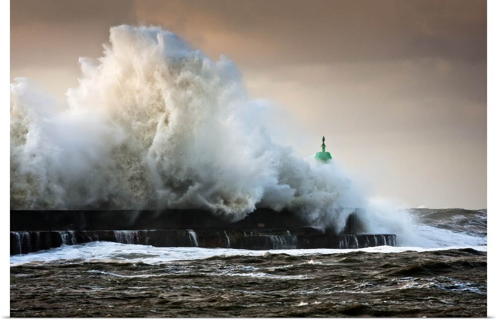 <p>A huge wave crashes against a pier, sending sprays of water into the air.</p>