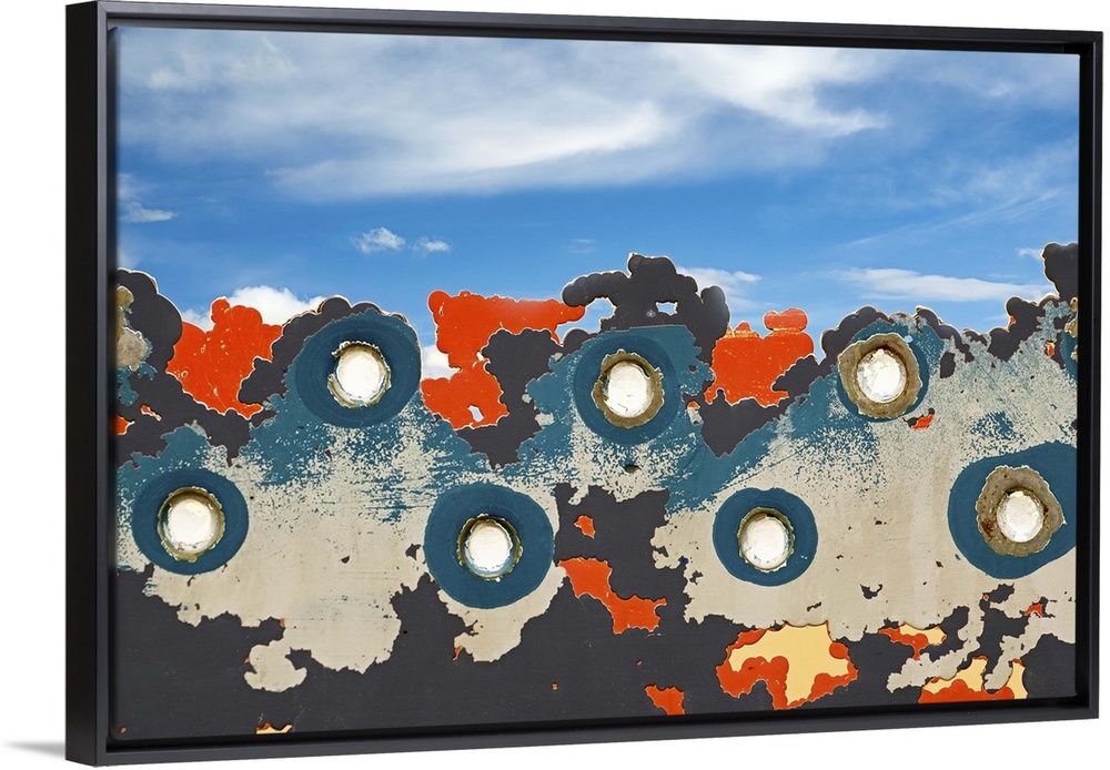 <p>Abstract image created by rivets and peeling paint against the blue sky.</p>