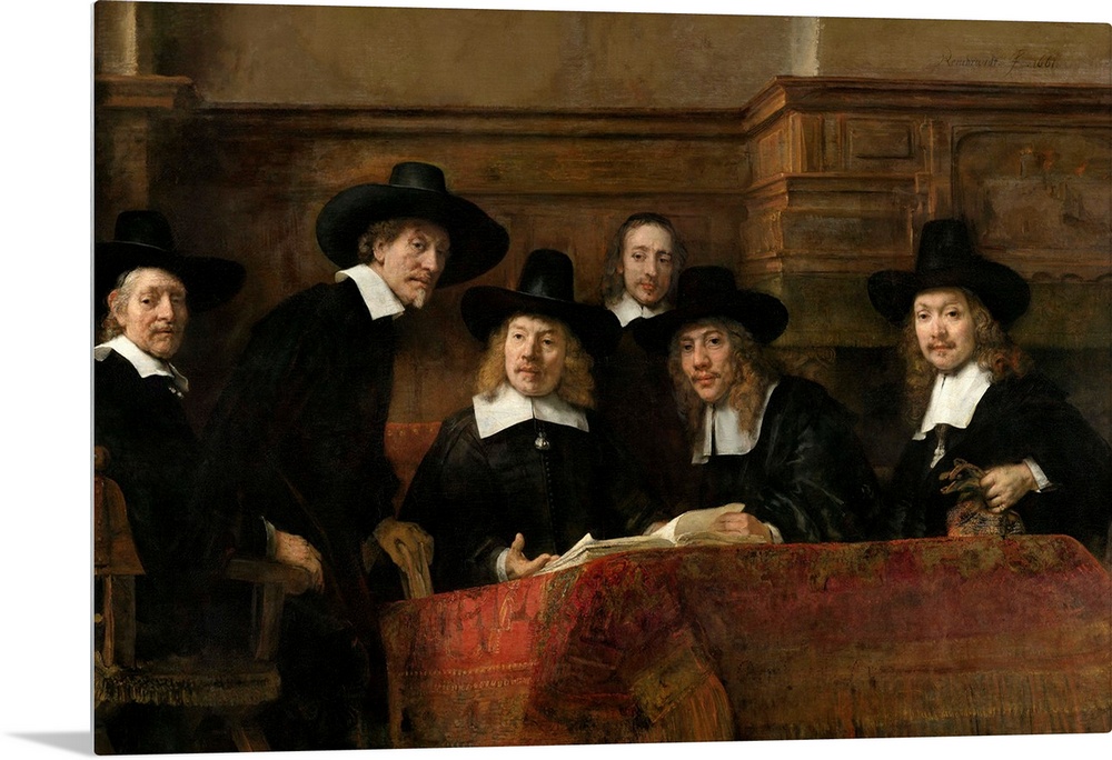 <p>Painting by Rembrandt of the Wardens of the Amsterdam Drapers' Guild, Known as The Syndic.</p>