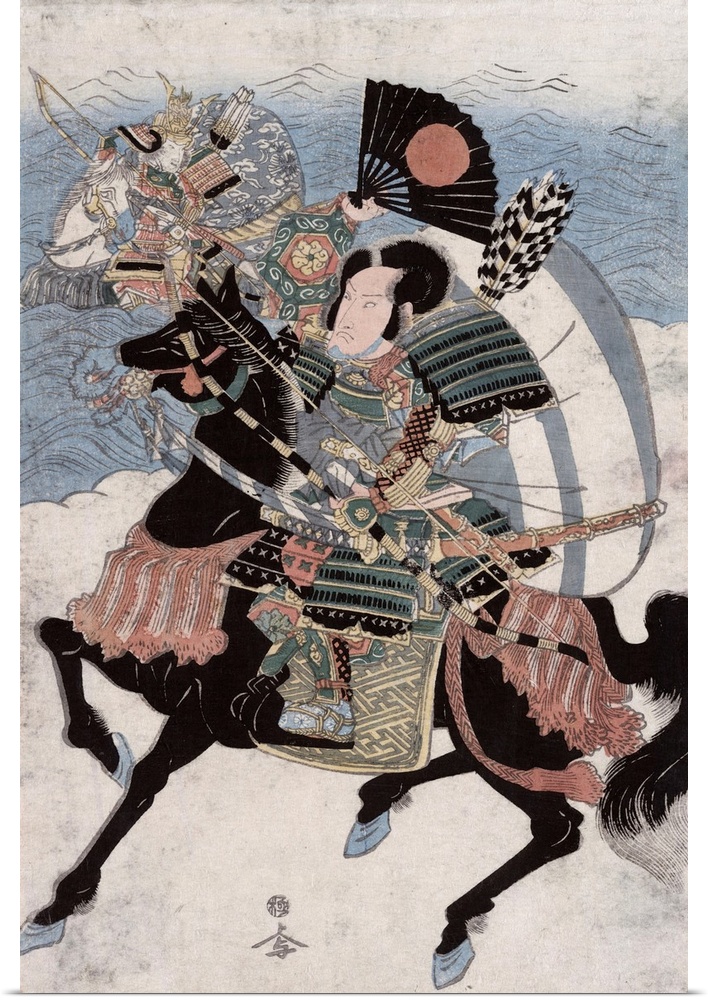 <p>The warriors Kumagai Naozane and Tairo no Atsumori on horseback with bow [and] arrows. Print, woodcut, colour.</p>