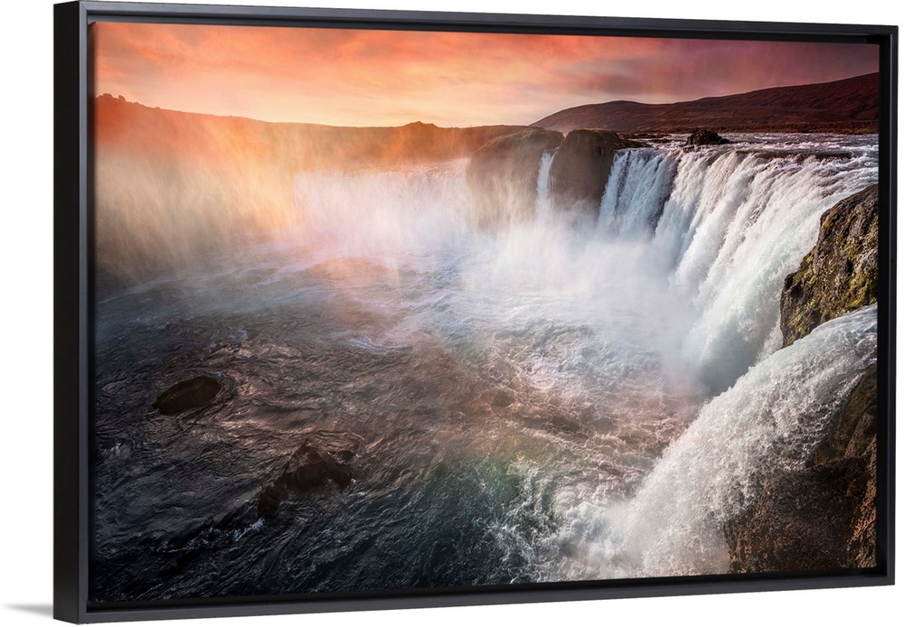 <p>Fine art photograph of a large series of waterfalls with orange sunlight shining down.</p>