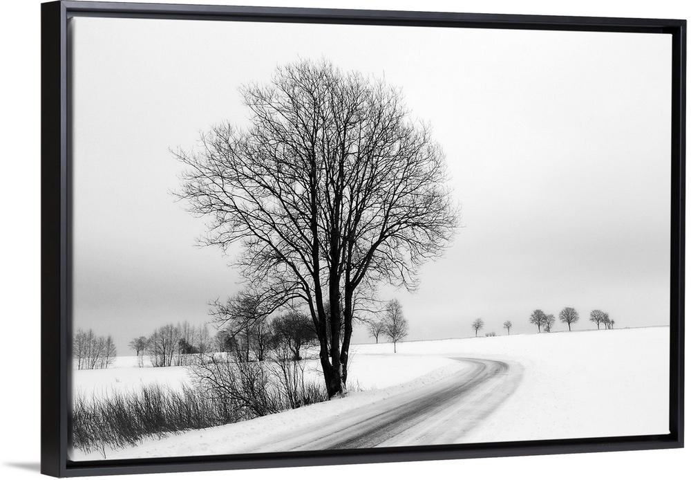 <p>A black and white photograph of a snowy country scene of a tree next to a road.</p>