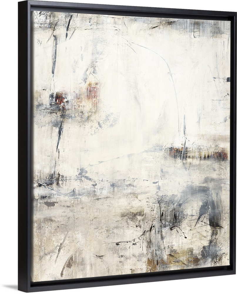 <p>A vertical painting of washed colors of gray and brown with dripped paint textures and swirled brush strokes.</p>