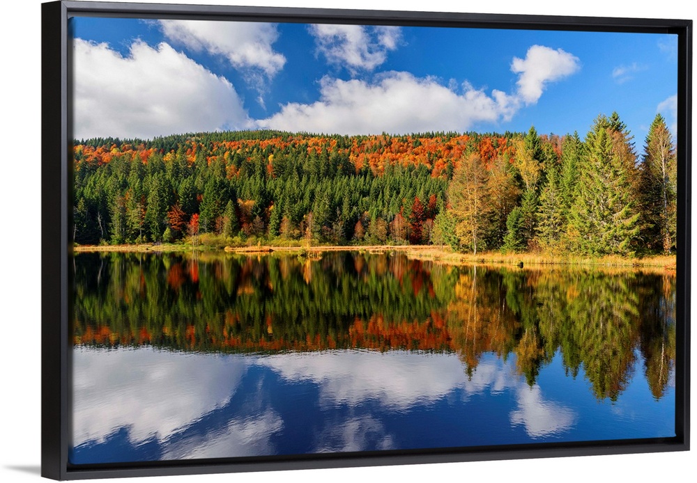 <p>Trees in a variety of fall colors mirrored in a lake with a blue sky above.</p>